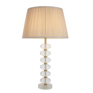 Stacked Facets Of Frosted Crystal Glass, Twinned With Matt Gold Details And Finished With A Oyster Silk Fabric Shade. This Table Light Is Ideal To Add A Touch Of Luxe To Your Interior.